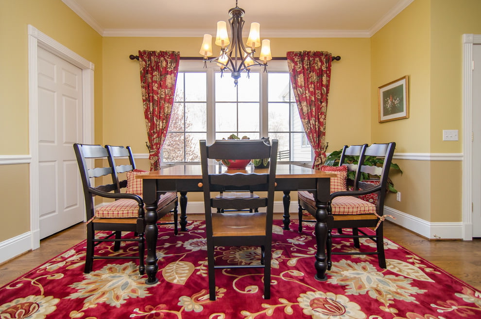 To add coziness and warmth to the dining room atmosphere, just lay a carpet with patterns