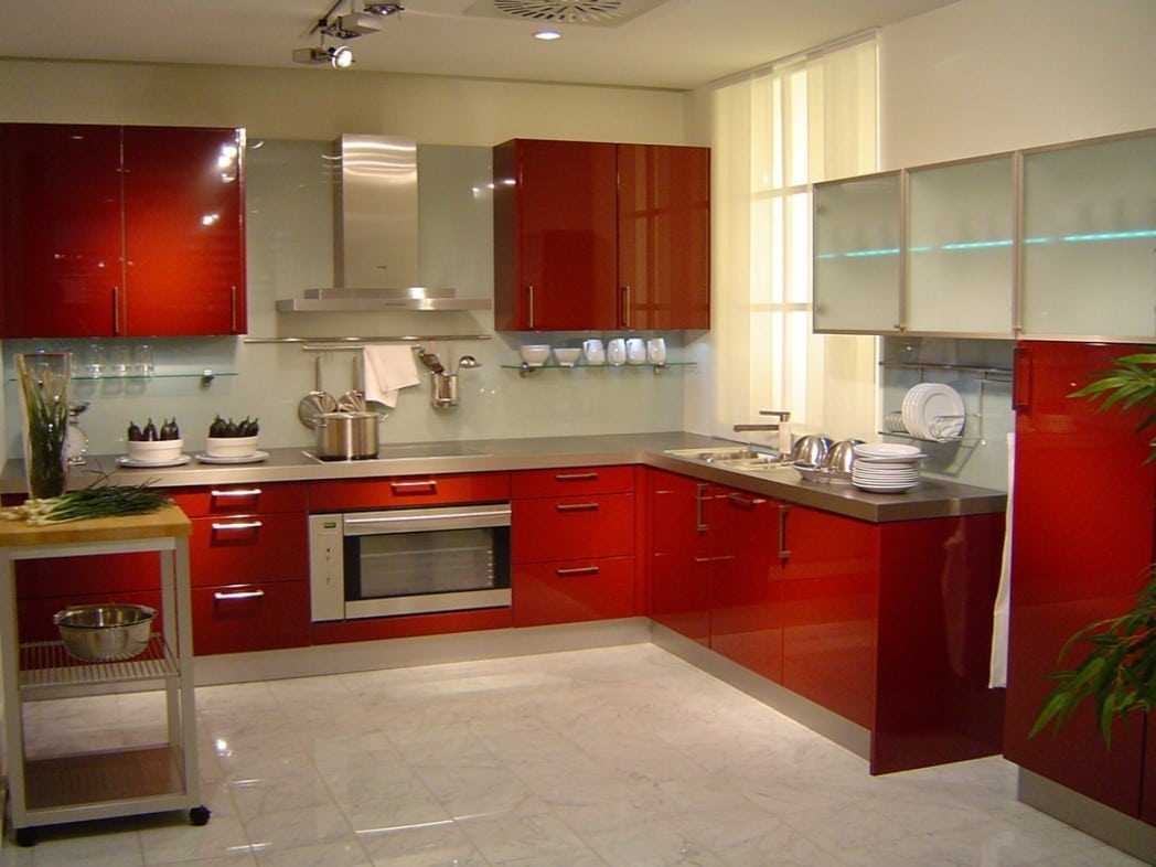 Bright red color in the interior of the kitchen