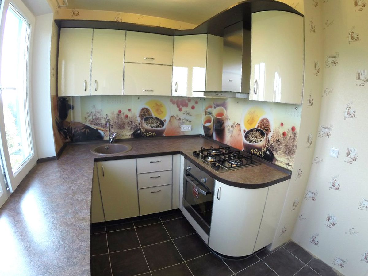 Plastic, metal, glass - the basis of the headset. Smooth glossy facades look neat and stylish. Gloss and glass elements visually expand the kitchen without overloading the interior. Cabinets with glass wings or open shelves look much lighter than their counterparts with blind facades.