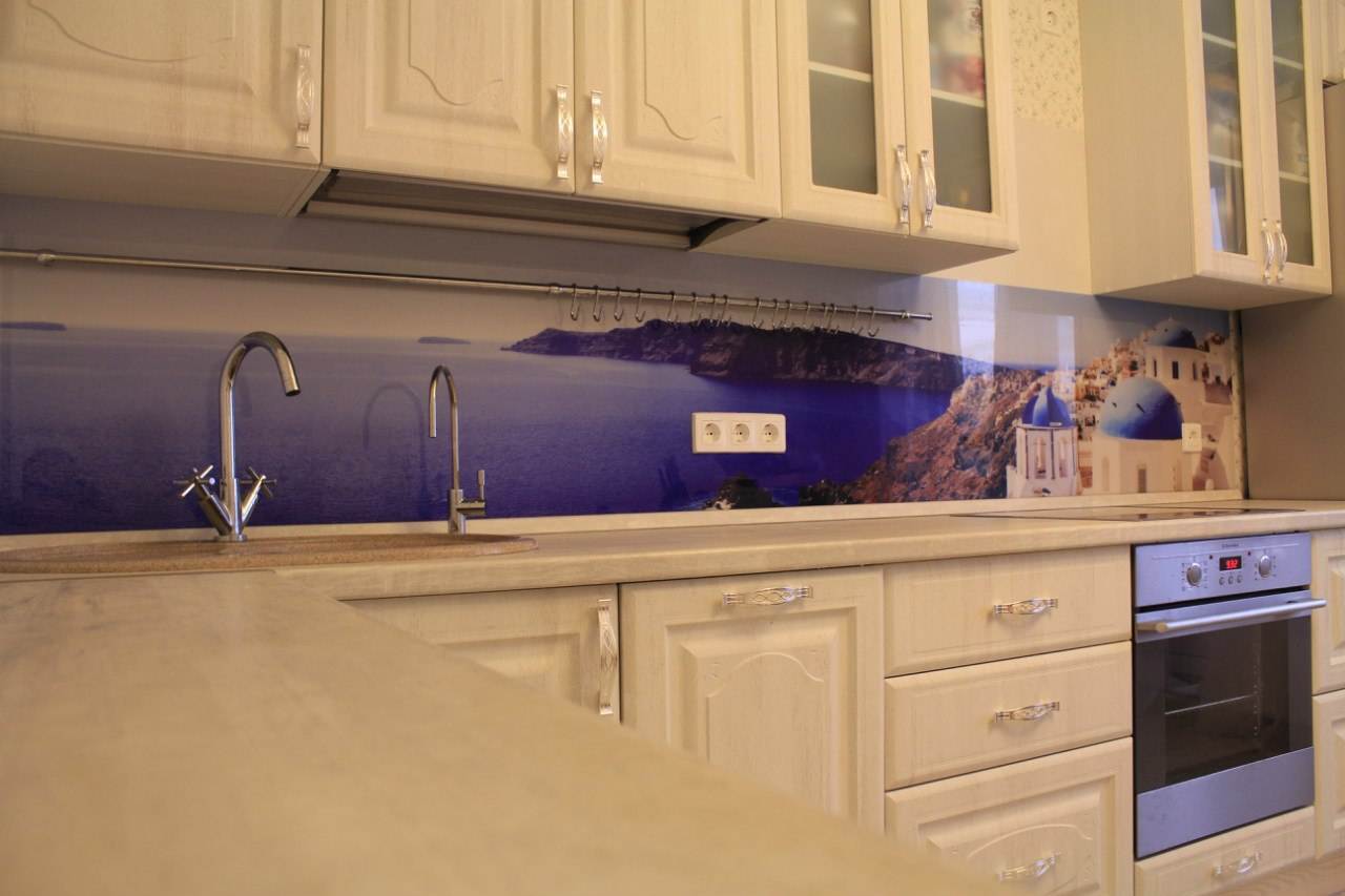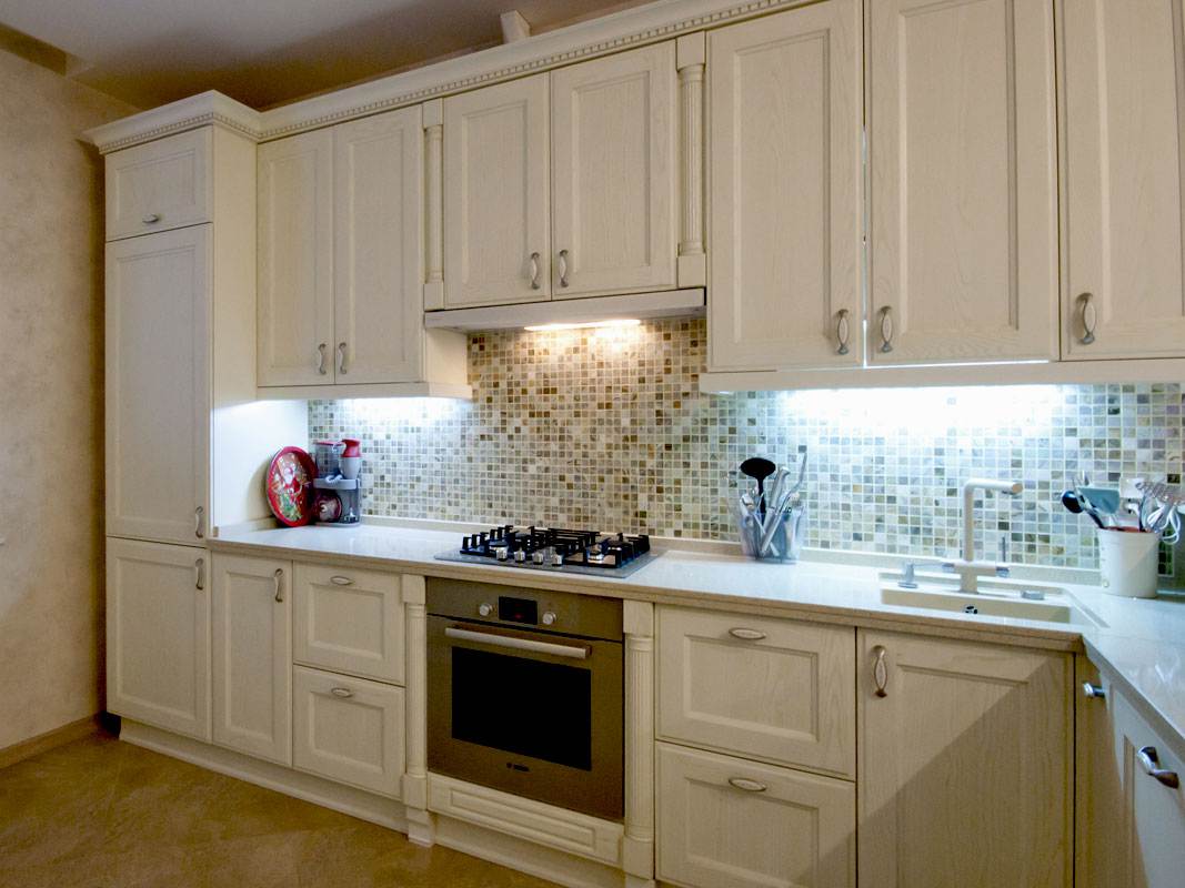 - Best of all, the work area should be illuminated - a countertop, stove and sink. In addition to the top light, you can use the luminaires built into the visors of the wall cabinets. A glass worktop with interior lighting will not only make the work more comfortable, it will also add uniqueness to the kitchen design.