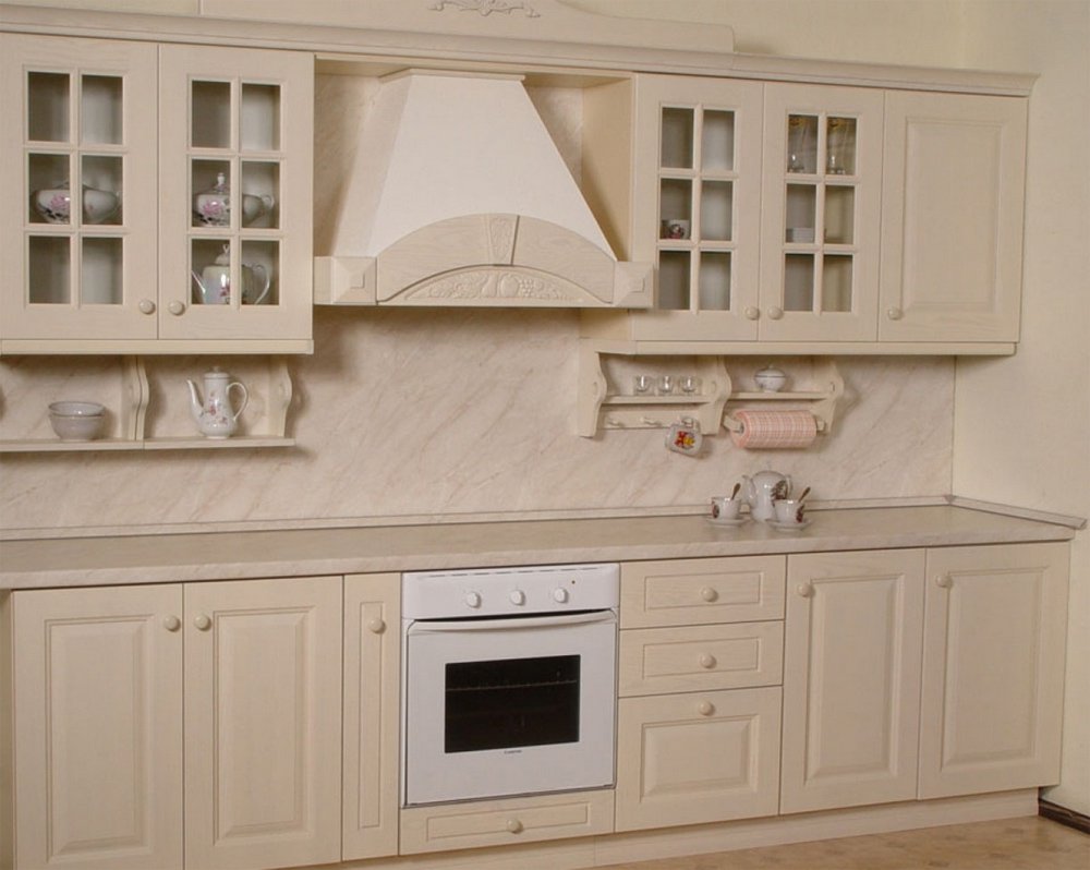 The whole gamut of style is based on natural shades, which, of course, includes beige. The interior of such a kitchen uses heavy massive furniture made of wood. The ideal option is really old cabinets and cabinets with small defects - scuffs, cracks, chips. These little things do not spoil the country, on the contrary give the house a charm and warmth. If the whole set is brand new, but did not inherit from his grandmother, he can be artificially aged with craquelure varnishes.