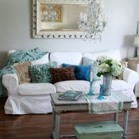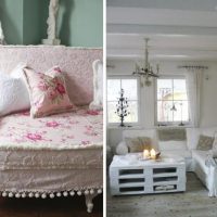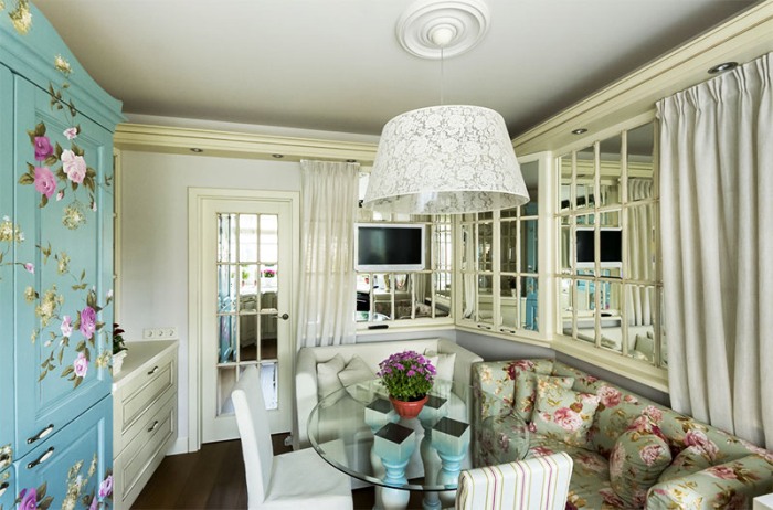 Furniture is also chosen in light shades, a table can be covered with knitted napkins, put a vase of flowers on it.