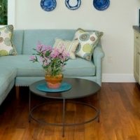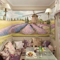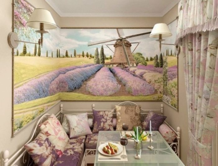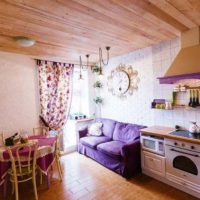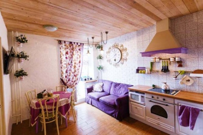 Provence style kitchen is the main place in the house.Here, work is going on all the time: soup is cooked, cakes are baked, meat is cooked. Therefore, in the interior of the kitchen there are always a lot of cabinets and utensils, the presence of fruit baskets and flowers. A good option would be to choose a wooden sofa in the kitchen with Provence style upholstery.