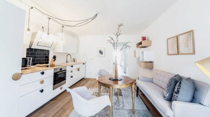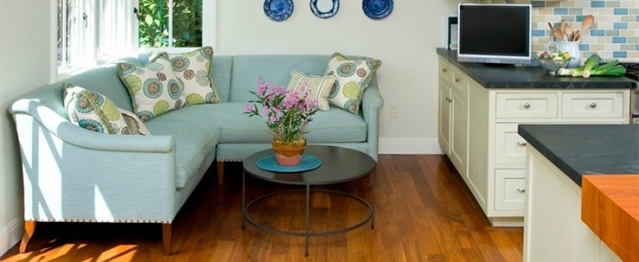 Provence style kitchen with direct sofa.