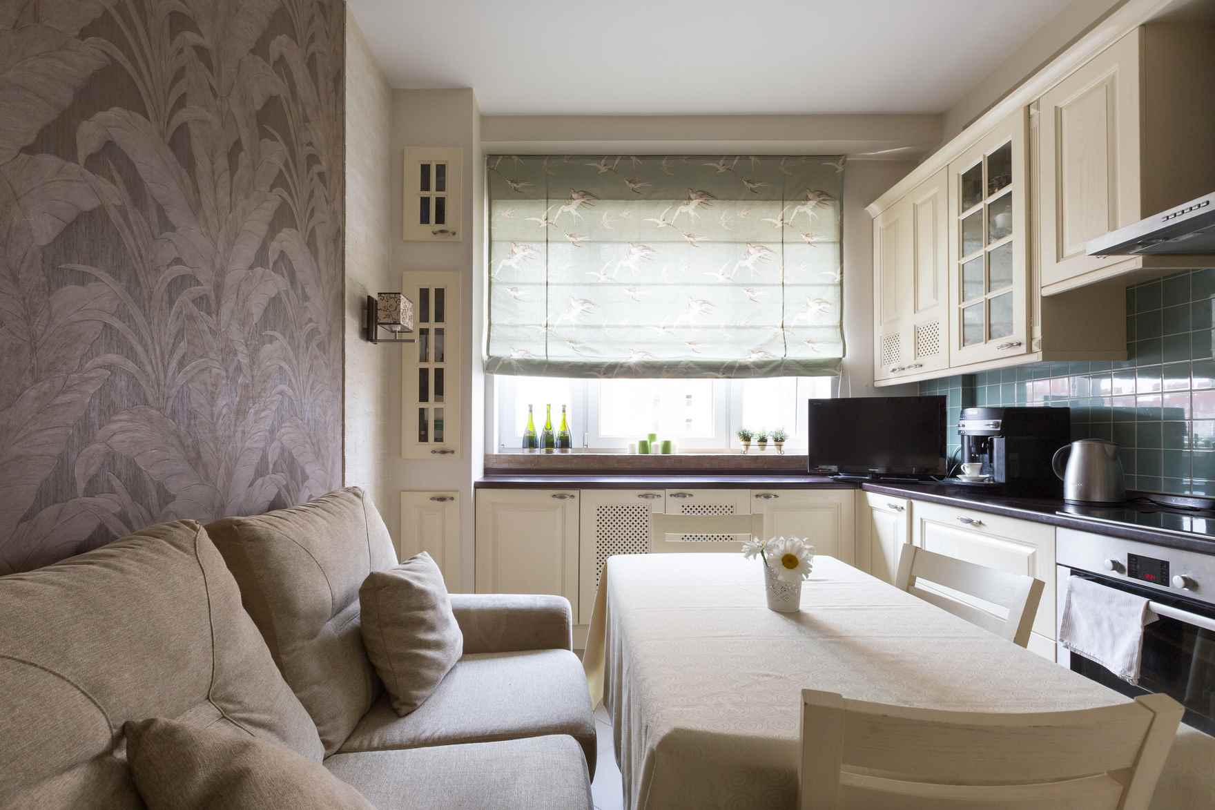 - A young couple also does not need a large dining table if they are used to having breakfast and lunch on upholstered furniture. They are suitable for youth design kitchen 11 meters with a sofa and a small table opposite the TV panel.