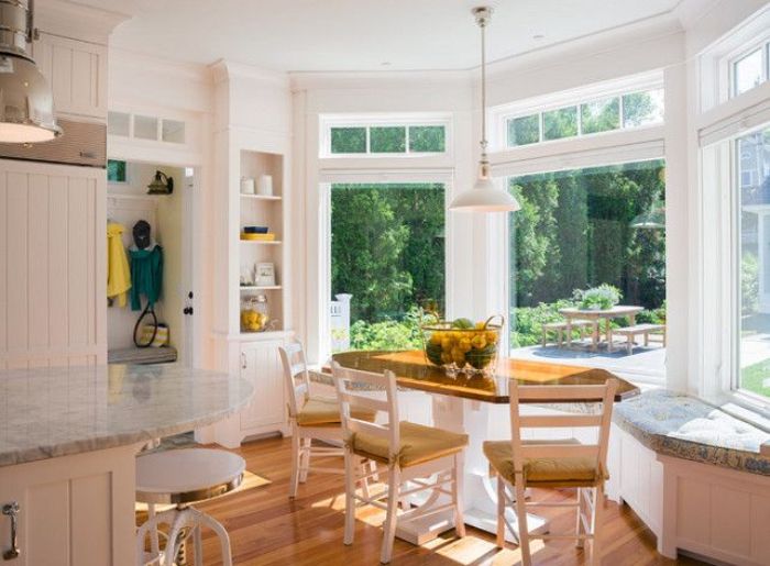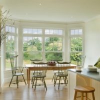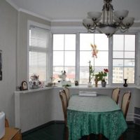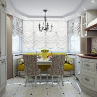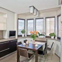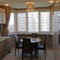 The place of eating in the bay window area is made out by a built-in or free-standing table of a suitable shape. This allows you to enjoy the view from the window while eating. If desired, a semblance of a bar counter is equipped here - often it is combined with an extended window sill.