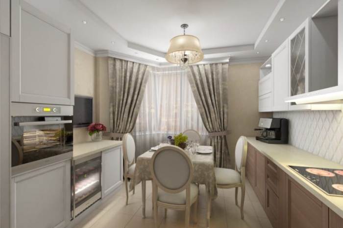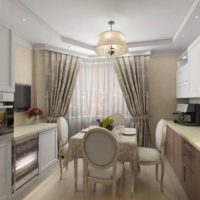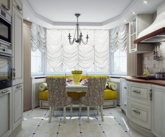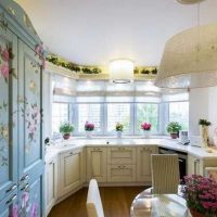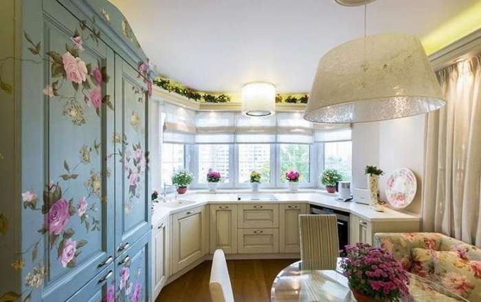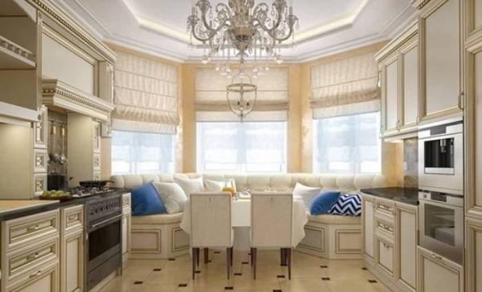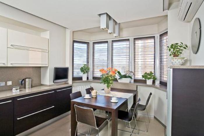 A kitchen room with a bay window protrusion almost always has an “irregular” shape, which allows you to create a unique design. The bay window has three or more windows, this element is usually part of the original architecture of the building, less often a glazed balcony, a loggia turns into it. Most often he speaks in houses belonging to the P-44T series, less often - with his own created buildings. The shape of such a detail can be trapezoidal, round, triangular, quadrangular, polygonal, etc.