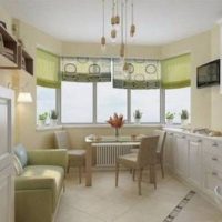 The bay window will be a great place for rest and relaxation. A pair of armchairs with a coffee table, a mini-greenhouse, which is nice to behold while sitting on a gymnastic mat during morning meditation, a sports corner, etc. are placed here. When a leisure zone is planned in this space, it is necessary to provide convenient places for storing handicrafts, relevant literature. This is convenient for those housewives who are used to doing something else at the same time as cooking - to sew, knit, draw, and more.