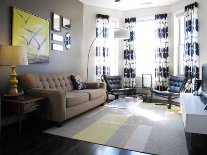 The zoning screen is made dense or purely symbolic - from the frame, with threads stretched over it, hand-woven in the style of macramé. The same goes for curtains. Separation using flooring also looks interesting: it can be two different colors of ceramic tiles, a combination of tiles and laminate, parquet and board, linoleum and painted fiberboard. When there is a children's or “sofa” zone in the bay window, they often put a carpet there, which is not acceptable for the working zone. Wall decoration with various materials is also very popular: a combination of wallpaper and decorative plasters, various types of paint and wall panels allows you to create an original design.