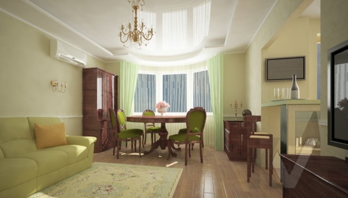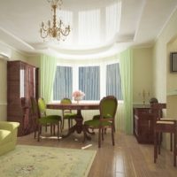 Bay window - an architectural multifaceted or rounded ledge on the facade of the building with windows. It is done in almost any room, sometimes significantly expanding its space. The original design of the kitchen-living room with a bay window is created by yourself or with the participation of invited experts.