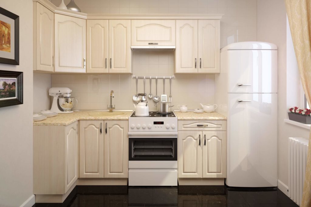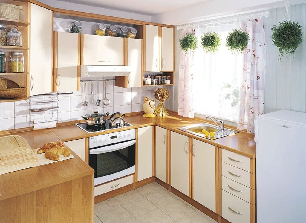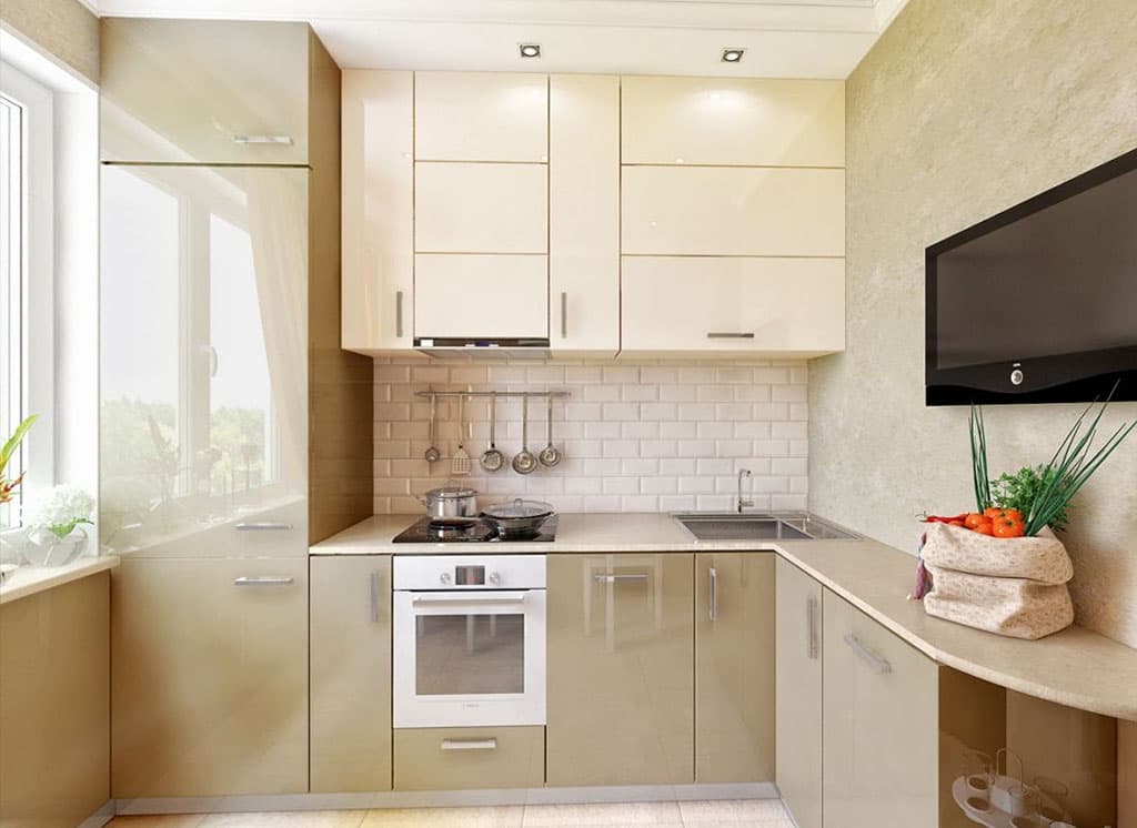 AT the kitchen area of 5-6 sq.m. the best solution would be a linear layout. At the same time, you should not purchase a lot of modules, it is enough to use several hanging and floor cabinets. If possible, to increase the usable area, you can use the window sill as a work surface.