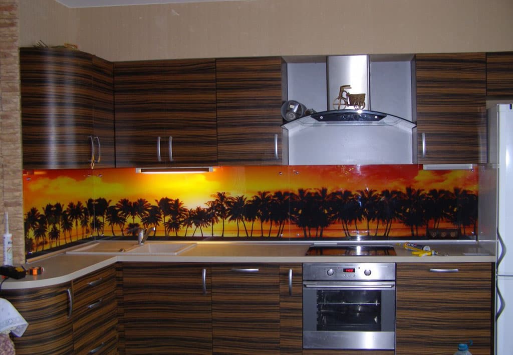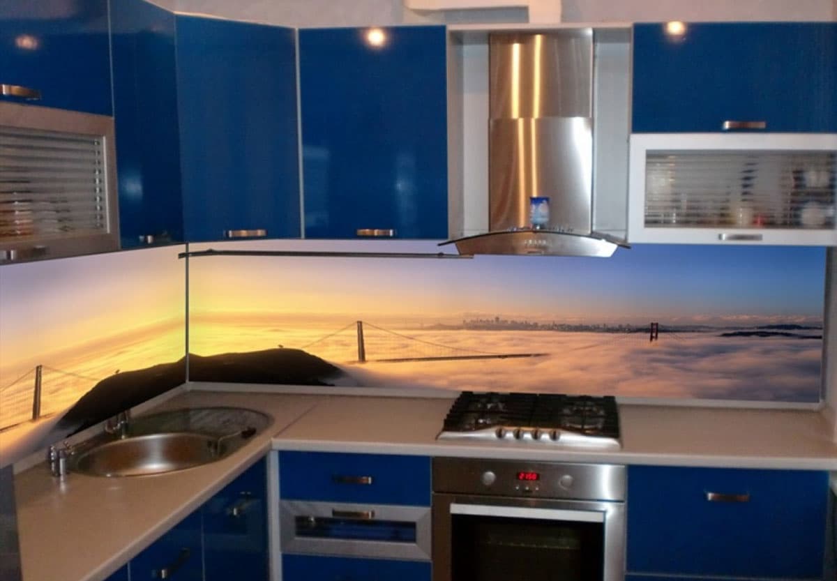An important nuance of such the kitchen It is considered the location of the apron along the entire line of desktops. |