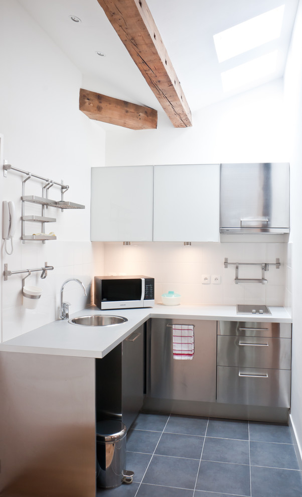 - Minimalism. The main rule of the style is a minimum of details, restrained colors, built-in appliances. An apron can act as a bright detail.