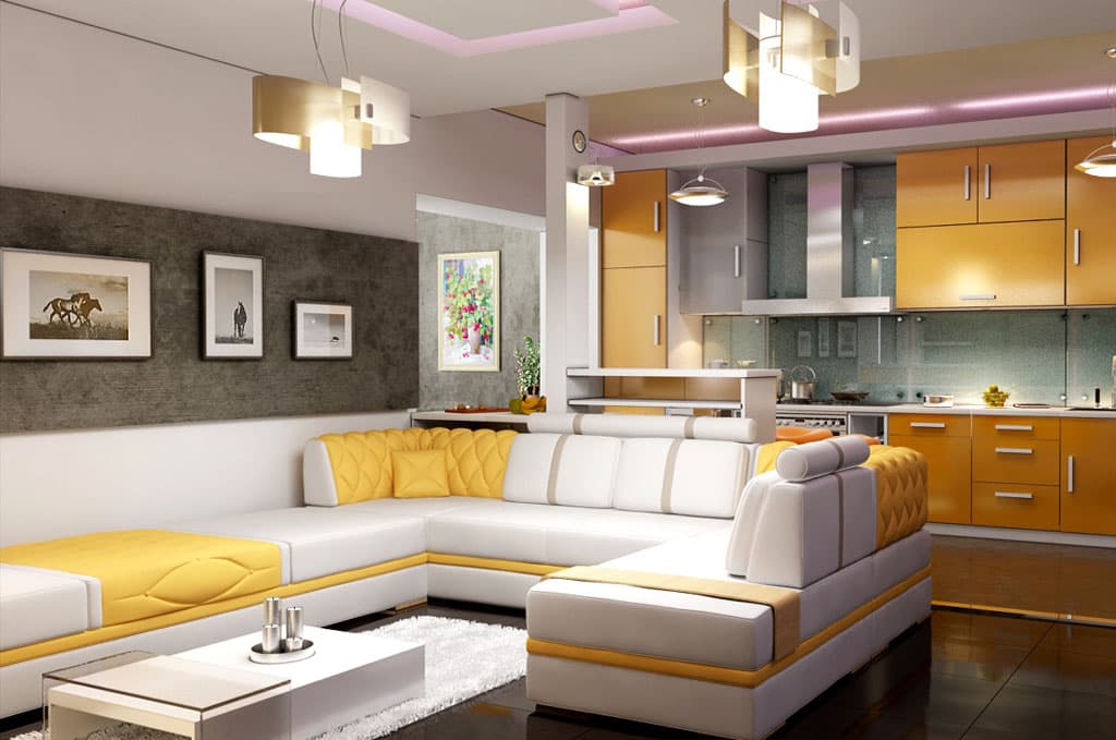 | U-shaped | This arrangement of modules creates the most functional area. However, a couch and a large dining table, most likely, will not fit into such a room.