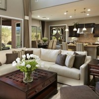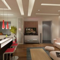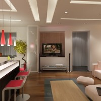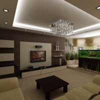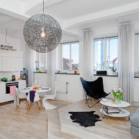 - To give islands of furniture comfort and coziness, pendant lamps are used. Over the place where the family dines, they weigh a festive large chandelier. The area with upholstered furniture is illuminated by a sconce or two floor lamps.