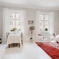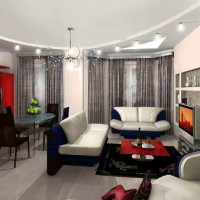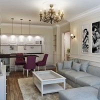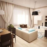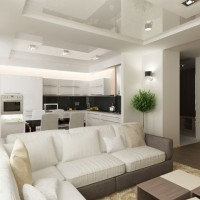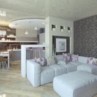 In such a design project, it is recommended to create a single space with a visual delimitation of the boundaries of the premises. It is not necessary to create capital partitions, it is enough to make arches, portable screens, sliding partitions, curtains from beads or threads. This will visually divide the room into zones.