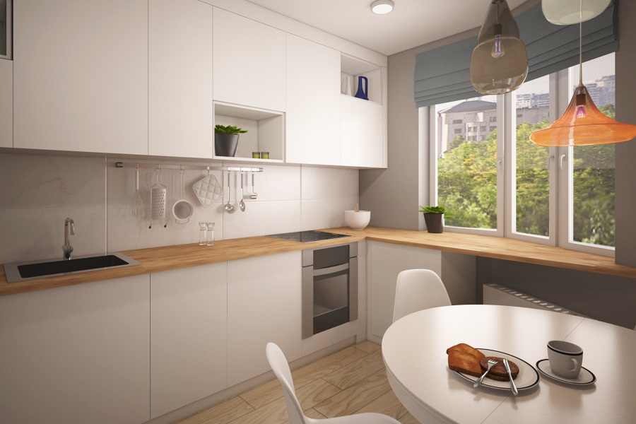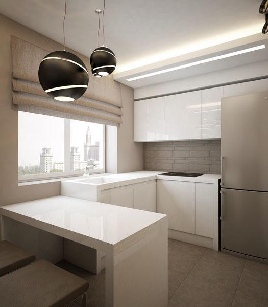 The kitchen set should be as functional as possible: nothing more, and everything you need. The game of contrasts of the dark bottom and the light top will look interesting. Such a design will make the interior of the kitchen project airy and light, visually expand and “raise” the room.