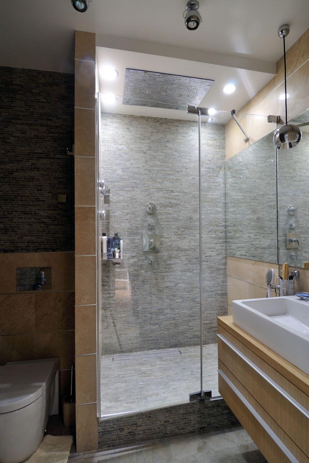 The interior of the bathroom is made in tiles of two colors - white and gray