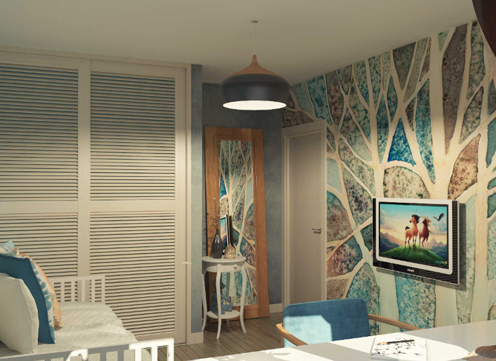 Layout for one person: the room is divided by a television stand into the dressing room and sofa area.Capacious storage system and visually open space appear