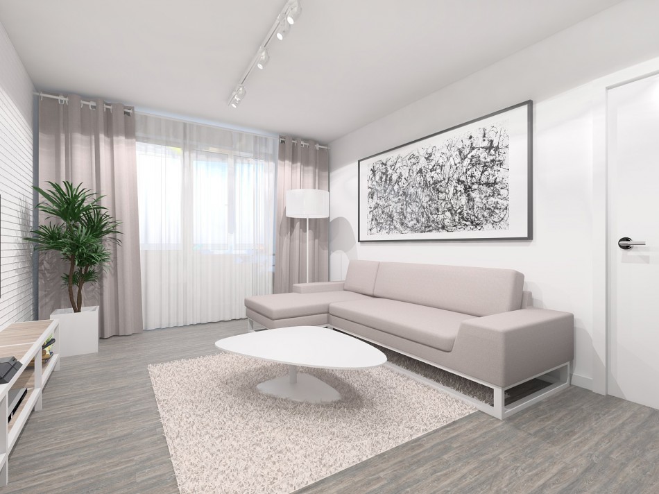 For the floor, it is better to stay in gray tones. This option is quite light, but not as easily soiled as white. In the kitchen, in the bathroom and in the corridor, tiles will be quite appropriate, and the laminate will fit well into the living room.