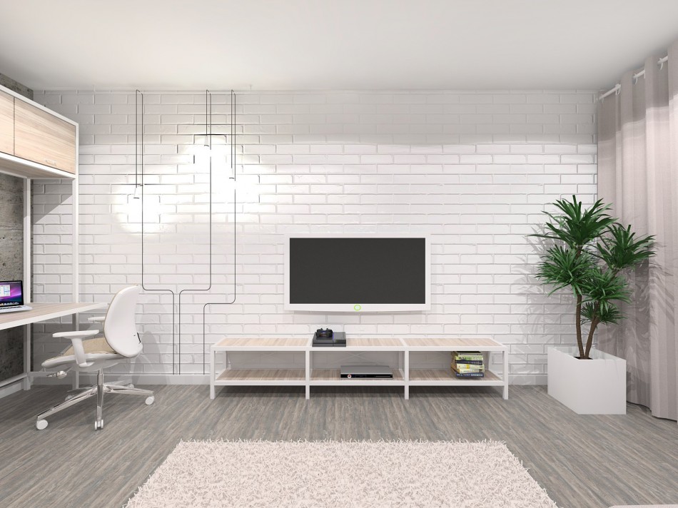 A coffee table and a TV in front of the sofa, and on the left is a place for work or study