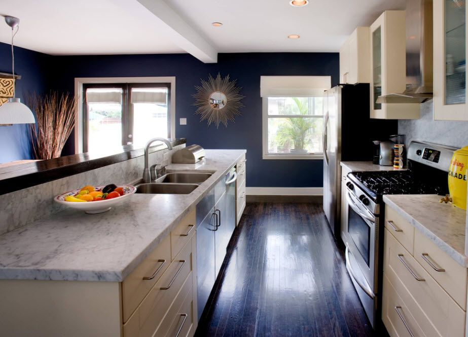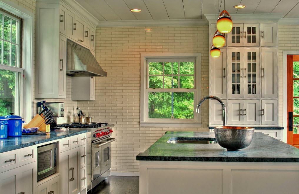The design of the walls of the kitchen should correspond to the chosen style and color. The wall of decorative brick looks stylish. This will bring comfort on the one hand and an element of rustic or urban style on the other. Decorating with decorative bricks can be combined with other types of finishes - such as plastering or painting. And it’s beautiful to distinguish by turning interspersed with wood, wood products that functionally fit into the design of the kitchen. It can be shelves with flowers or dishes, with decorative crafts made of various materials. They will look cute and create a cozy atmosphere and plants hanging from the walls, both from artificial and from living leaves and flowers. Brick finish is quite practical, moisture resistant, meets many requirements of the operation of the kitchen area.