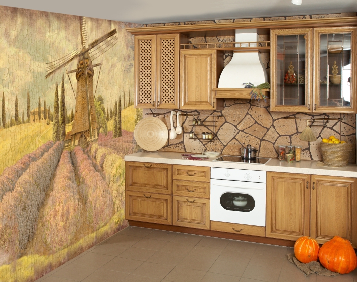 To simulate any decor material: paper, wood, leather, stone, metal, decorative plaster is used. The interior in this case looks luxurious, which is more advantageous as an option for decorating the walls of the kitchen. A variety of color palettes will allow you to create any picturesque masterpiece. The many benefits of this type of finish.