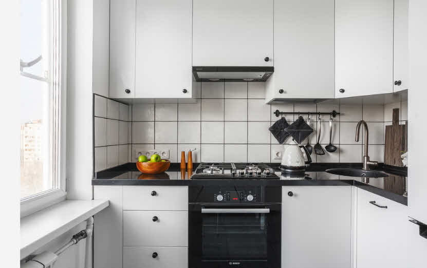 If the kitchen is small - you need to try to place the utensils and all the necessary kitchen utensils compactly, add more light. As lighting, you can use LEDs. For the effect of increased space, it’s nice to use glossy or mirror surfaces such as tiles.