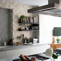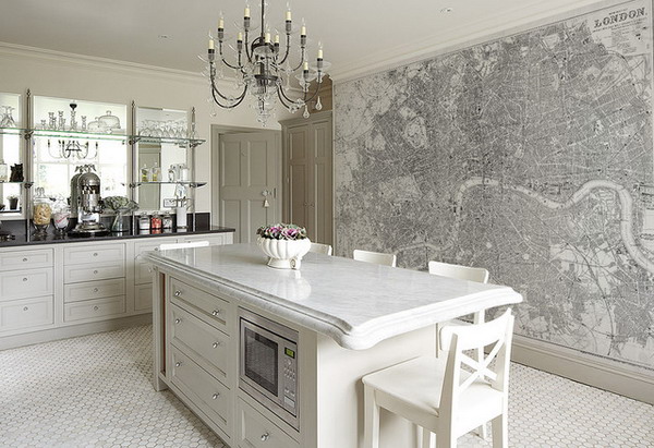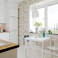 Washable wallpaper for a small kitchen will be a real find if the image is selected correctly. Combining vivid pictures with calm in tone walls and furniture, you will achieve an expansion of space. Wall murals in a kitchen in pastel colors should be diluted with bright furniture and accessories.