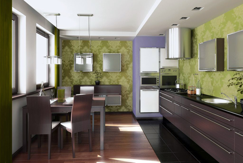 Before you buy photo wallpaper in the kitchen, you should decide on the color. The pattern should fit curtains, furniture, walls. The right color will expand the room and cover up the imperfections of the walls.