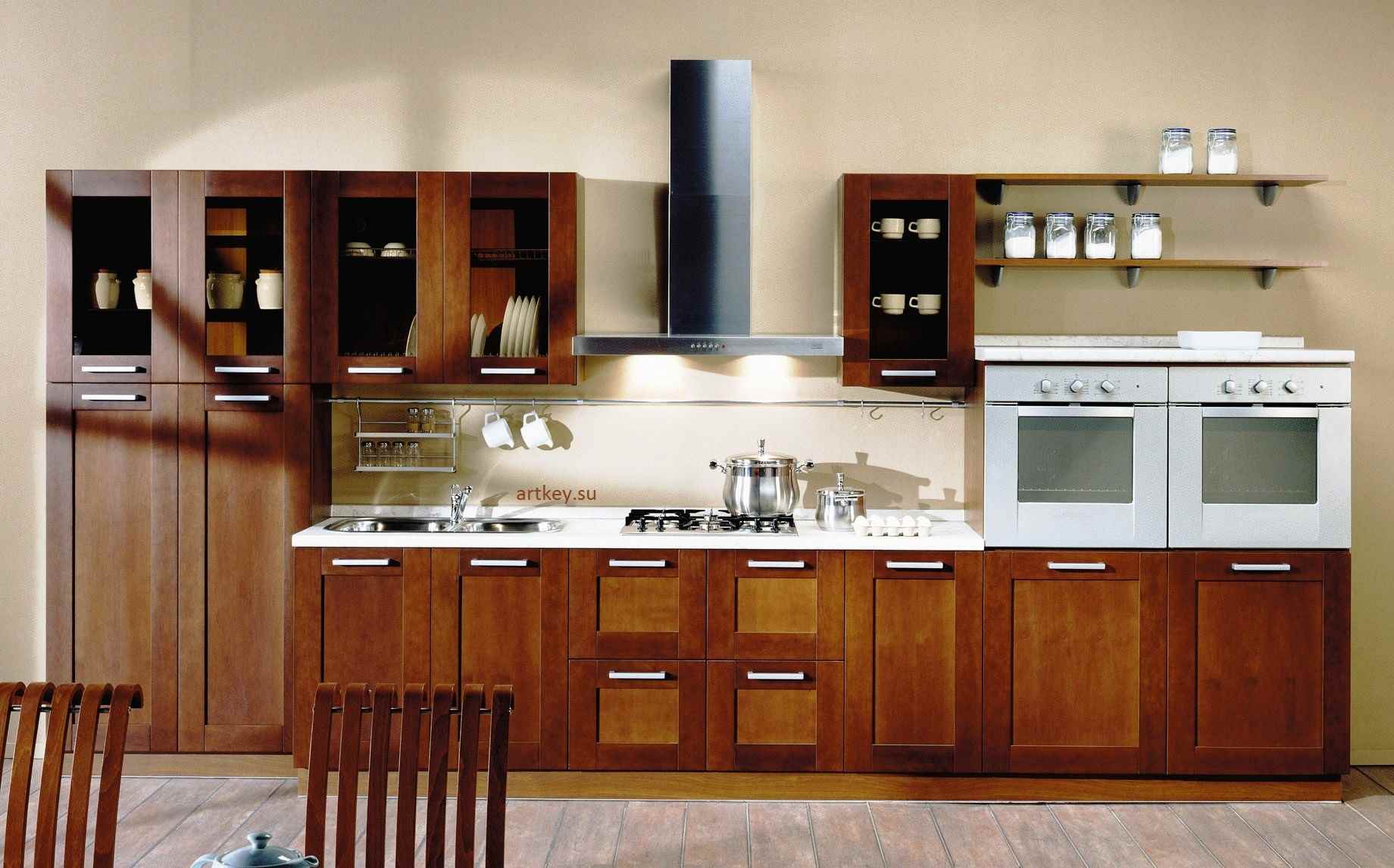 The details are set by the furniture set, household appliances and decor. All these items should complement each other, if the goal of the alteration is to create a stylish, harmonious design. In the interior of a classic kitchen, you can use furniture with such features.