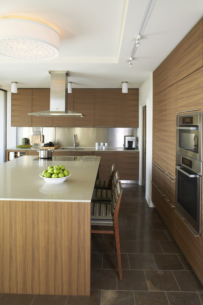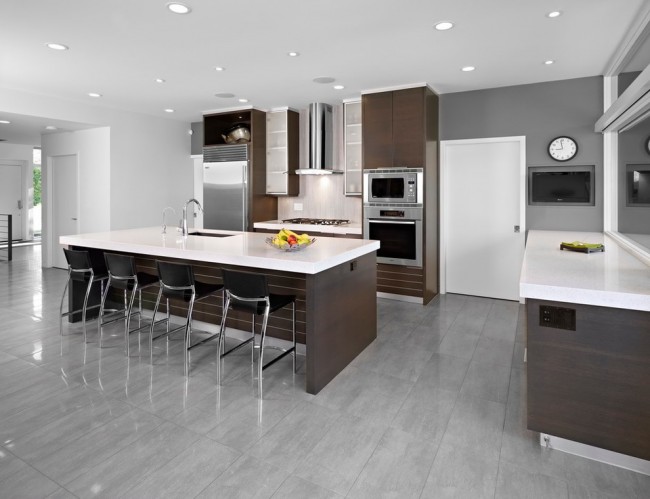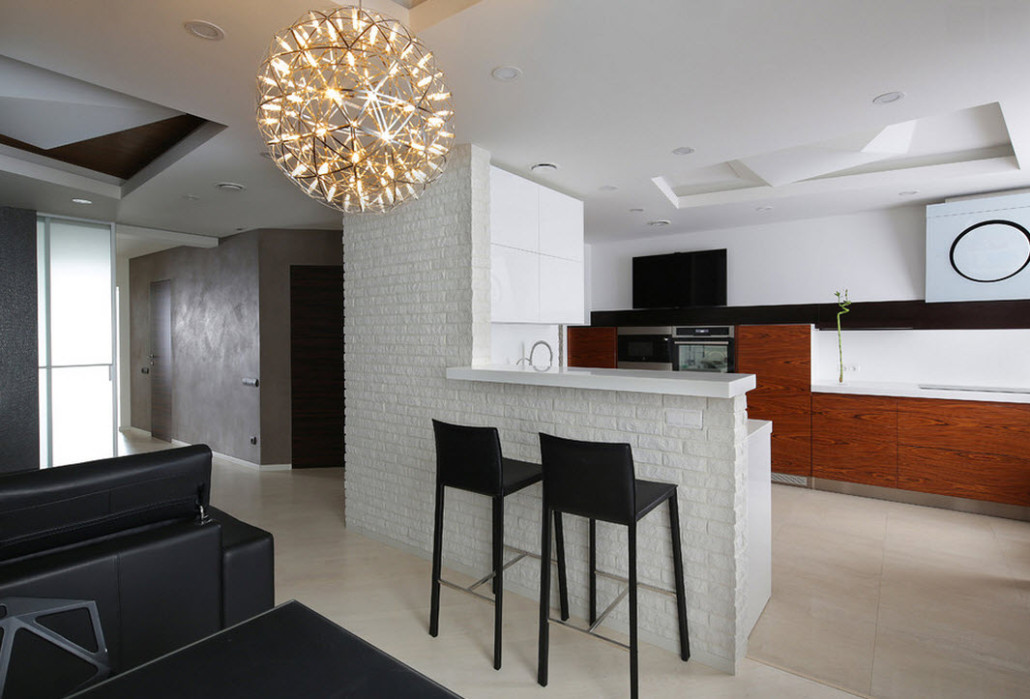 It is not limited to one ceiling chandelier. Additionally, fixtures are built in over the work surface, in the walls or even in the floor. Often lighting devices perform the function of zoning the room.