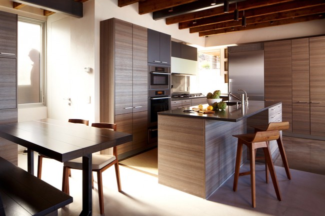 AT kitchens-studios, as well as on large areas, island planning can be used, where the cooking and working surfaces are carried out to the center of the studio room. Other items of furniture can be installed near the wall, regardless of the principle of their arrangement. To expand the functionality of the island, it is used as a dividing border between the working area and the dining room. An example of such a repair the kitchen shown in the photo below.