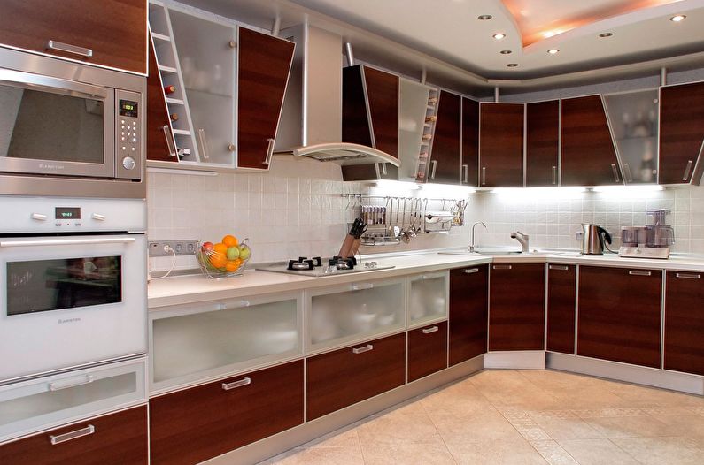 The angular layout allows you to optimally exploit the space and is ergonomic. It looks compact, combining practicality and functionality. This arrangement can be applied to the kitchen any quadrature. An example of such an arrangement of furniture at the kitchen in the photo below.