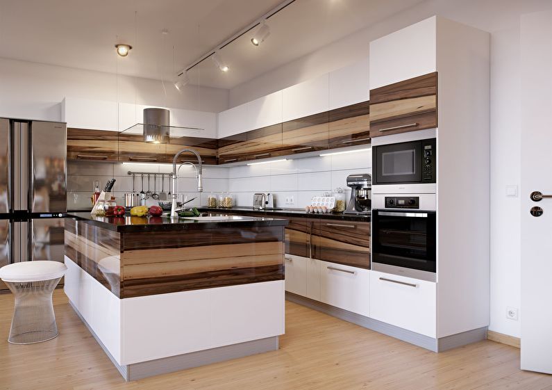 For facades, special films or enamels, glossy or matte, are used. An important nuance is the availability of places for built-in appliances. When decorating a furniture facade in modern style light milling can be used.