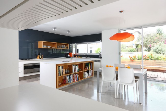 Also for rooms with sufficient quadrature in modern style you can build a podium that will allow you to separate the working area from the dining room.