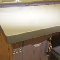 Production of floor boxes is carried out first of all. This is necessary in order to subsequently assemble the countertop. The latter is made specifically for this purpose. Its thickness is very different from ordinary sheets of chipboard for stands and shelves. Suitable sizes start at 30 mm and go up to 60 mm. The tabletop coating is made of very durable plastic, which is resistant to abrasion and moisture.