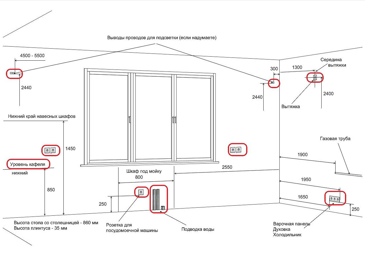 Important. Measurements should be made at three points: floor, wall, ceiling. Incorrect room geometry can affect the inconsistencies of hanging cabinets or other elements. Also, be sure to consider the location of the main networks of the apartment or private house. This applies to electricity, plumbing and sewage. Do not forget about the exhaust system.