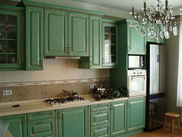 | Classical | In this case, noble shades of green are used: malachite, emerald, jade, others.This style eliminates flashy details, pronounced accessories. The set is bought wooden, the apron is made of mosaics. |