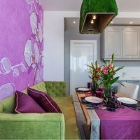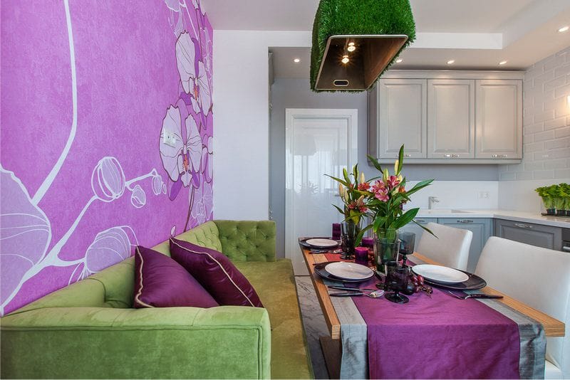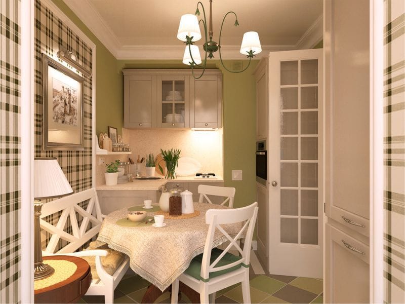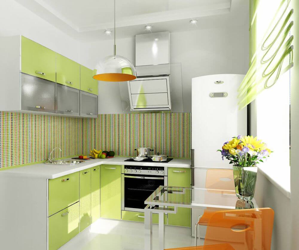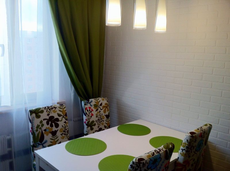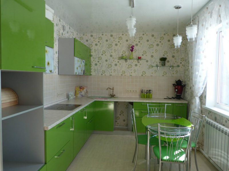 The kitchen has a dining area. Usually it consists of a table, several chairs. In a small room, a glass table will look great. It does not take up much space, as it were, dissolves against the background of the finish. There should be few accessories in the room. Usually, their role is played by beautiful textiles in green tones, original dishes, living plants.