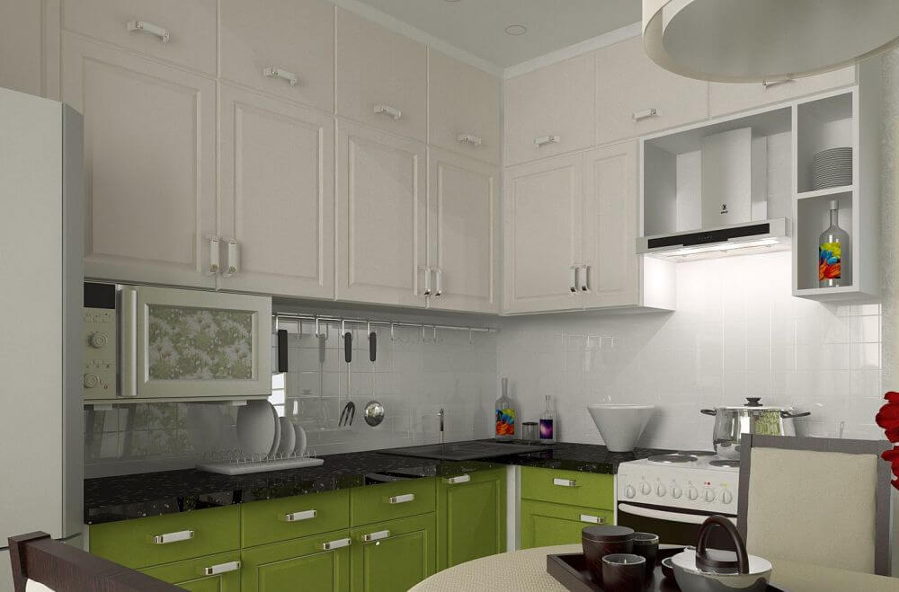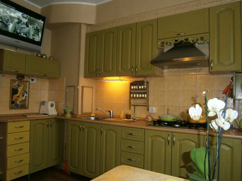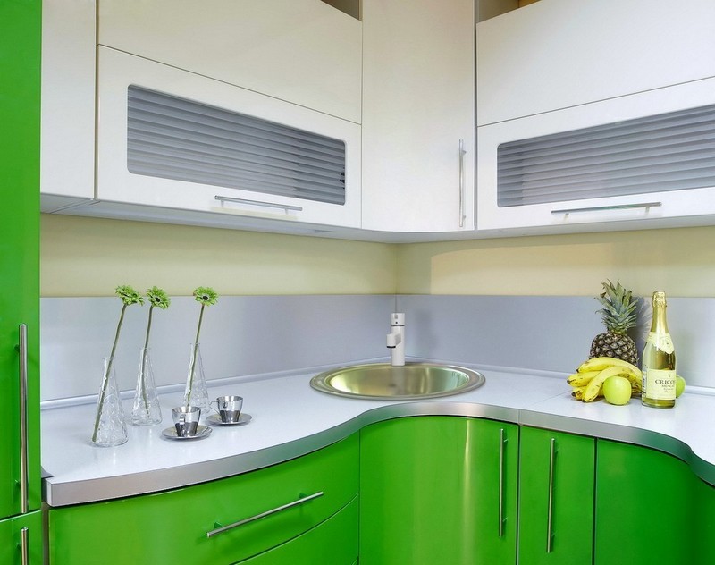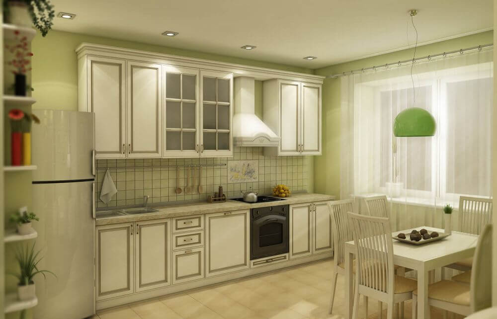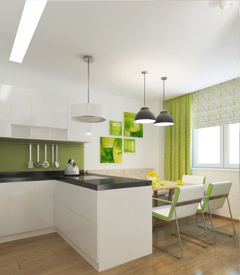 - Small green kitchens should be bright. It is better to combine the main color with white in them. Then the space will look bigger, more comfortable. A large room does not limit its owners in choosing. It’s much easier to “work” with it.