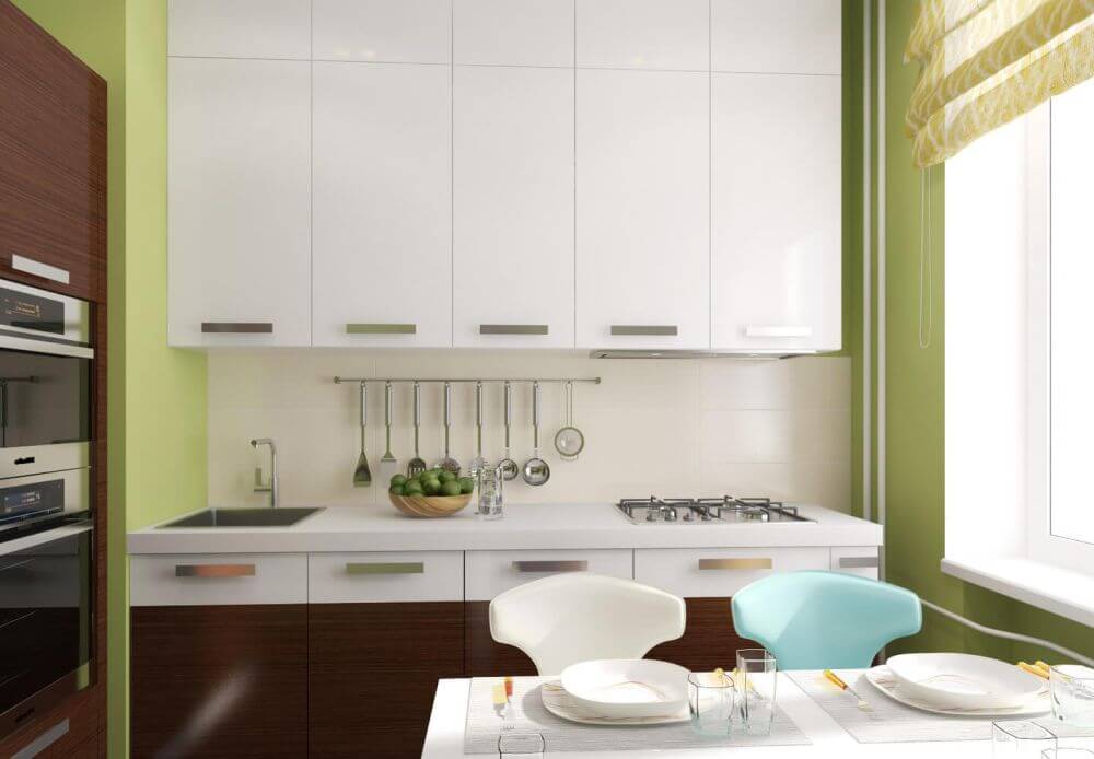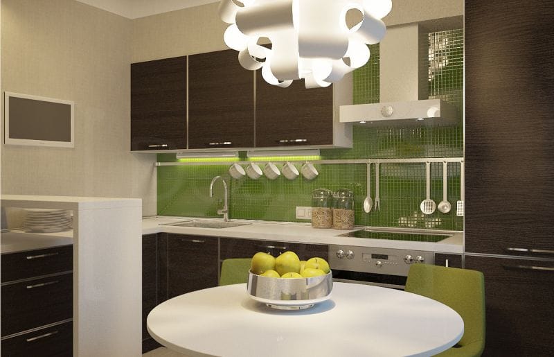 - With brown. The classic solution. However, it is important not to overdo it with brown. It needs a little. Brown can be a countertop, table, chairs. The rest is best done in green colors.