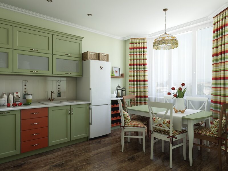 - With red. Red-green kitchen - an original solution. It will appeal to young, creative people. The red color in the decoration looks rich, spectacular. Sometimes red is used only in decorative elements. If the family has hypertension, red is best avoided. It can cause an increase in pressure, which is dangerous for the health of such people.
