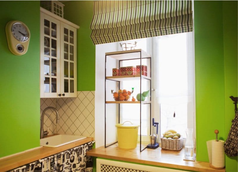 In the green kitchen every detail will be important. Curtains are no exception. Their color should be in harmony with the color of the kitchen set. If the headset is very bright, this does not mean that the curtains should be the same. It is better to buy curtains of the same color, but more muffled. Curtains can have a pattern, ornament. They must be made of natural fabric. Synthetic fabric looks cheap, quickly loses its attractive appearance. Curtains should be easy to remove, withstand frequent washing in the machine.