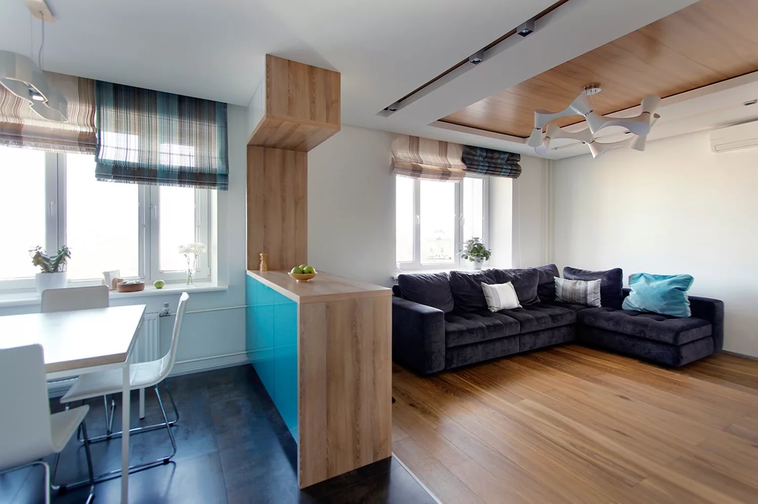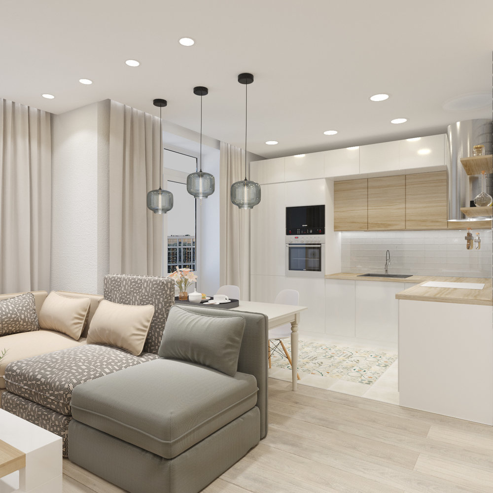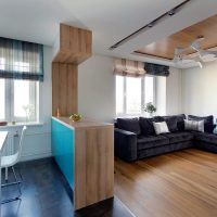 To zoning a room into the kitchen and living room, furniture is often used, for example, a dining table with chairs or a sofa, a kitchen island or upholstered furniture from the living room.
