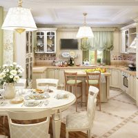 The style of the French province goes well with neoclassicism. This combination can be used to design a combined interior. The aesthetics of Provence is well suited for the kitchen area, and neoclassic with its simplicity and functionalism for the living room.