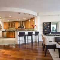 In order to additionally zone the room visually, it is recommended to choose different flooring for the kitchen and living room. For example, ceramics and parquet, porcelain stoneware and laminate. Not necessarily the coatings should match in color, but they should be in the same style.
