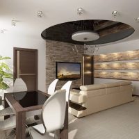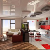 The ceiling is common for two rooms, and therefore it should be decorated in the same style. A multi-level ceiling is perfect, as it allows you to make spotlights, and also fits most styles in the interior. In order not to overload the design, it is recommended to choose a light finish for the ceiling.