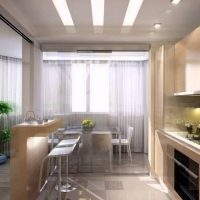 The kitchen space can be separated by a light curtain on lambrequins or a custom curtain made of beads or threads. Curtains and curtains are a great way to zone the room in a romantic style, country or Provence.