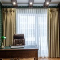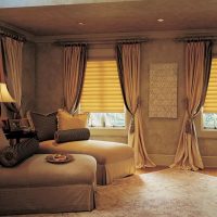 One of the most popular window decoration options used in rooms of any purpose. These are long dense canvases that go down to the floor. Variations are possible: curtains, consisting of one or two paintings. The variation in the color scheme of the curtains is quite wide. This is an option that looks great in dark colors. The range of materials from which they can be made is diverse. Both artificial materials and natural fabrics are suitable.